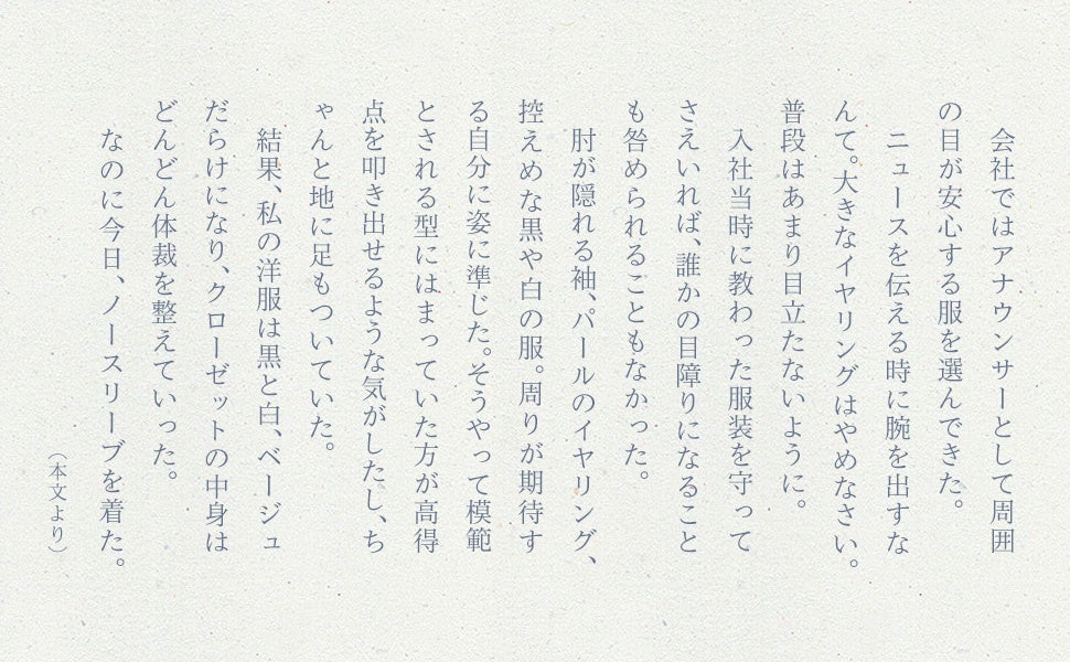 会社ではアナウンサーとして周囲の目が安心する服を選んできた。ニュースを伝える時に腕を出すなんて。大きなイヤリングはやめなさい。普段はあまり目立たないように。