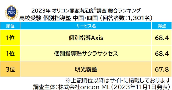 『個別指導塾 中国・四国』 総合1位は【個別指導Axis】【個別指導塾サクラサクセス】が同点受賞
