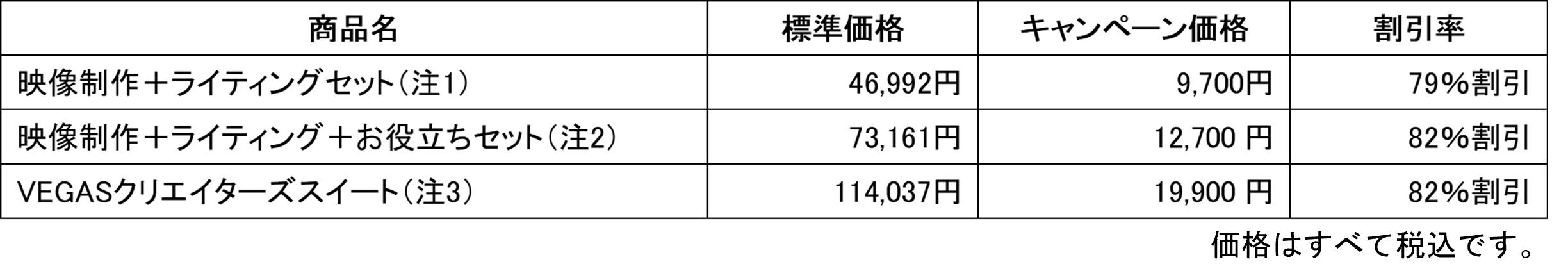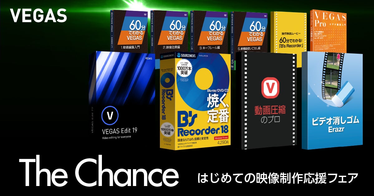 1月15日(土)から1月28日(金)までの14日間、弊社サイト上で、世界的に有名な映像制作ソフト「VEGAS」シリーズを特別価格で提供する「はじめての映像制作 応援フェア」を開催します。本フェアでは、シリーズ最新版の「VEGAS Edit 19」を50%割引で提供するほか、はじめて映像制作にチャレンジする方に必要なソフトをセットにしたパック製品を最大82%割引で提供します。