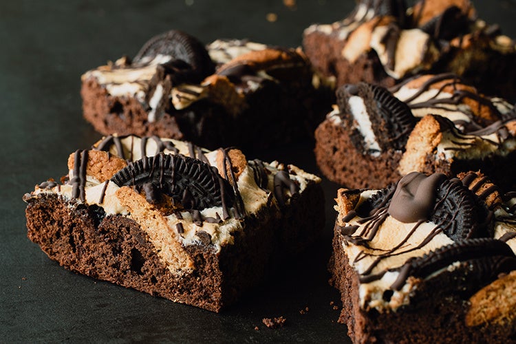 ダークチョコレートで仕立てた濃厚な生地に、ブラックココアのクリームサンドクッキー、ザクザクの全粒粉ビスケット、マシュマロをトッピング。チョコレートソースを掛けて仕上げるボリュームたっぷりのマッドブラウニーは、冬の風物詩のひとつ。見た目もおいしい限定ベーカリーです。