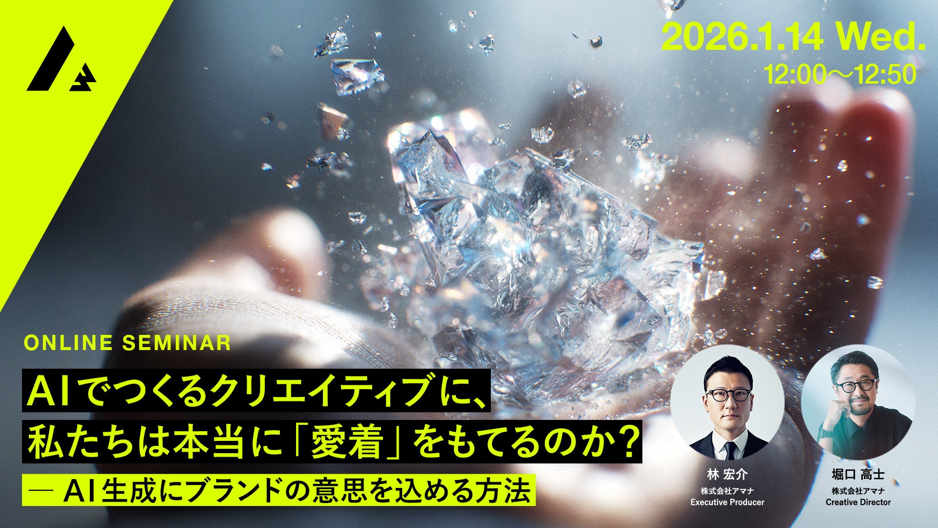 コミュニケーション変革をクリエイティブで実現する株式会社アマナ(本社:東京都品川区、代表取締役社長:金子剛章、以下「アマナ」)は、2026年1月14日(水)、『AIでつくるクリエイティブに、私たちは本当に「愛着」をもてるのか? ― AI生成にブランドの意思を込める方法』をテーマにウェビナーを開催します。
