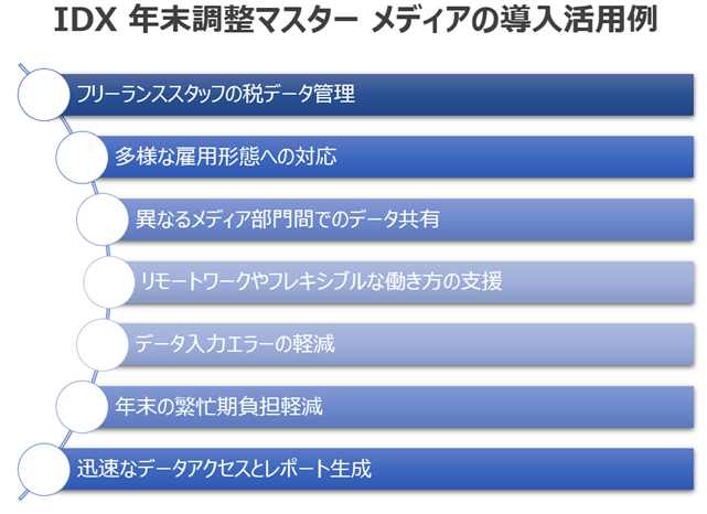メディア業界では、年末調整業務における負担が特に大きく、繁忙期には多くの業務が重なりがちです。広告、出版、放送などの各部門で従業員が多岐にわたることや、フリーランスや契約社員など多様な雇用形態のスタッフも多い点から、正確で効率的なデータ管理が求められます。また、リモートワークの増加に伴い、どこからでもスムーズに年末調整が行える仕組みも重要です。このような課題に対して、「IDX 年末調整マスター メディア」は業界特有のニーズに応える最適なソリューションとして活用が期待されており、以下のような活用例があります。