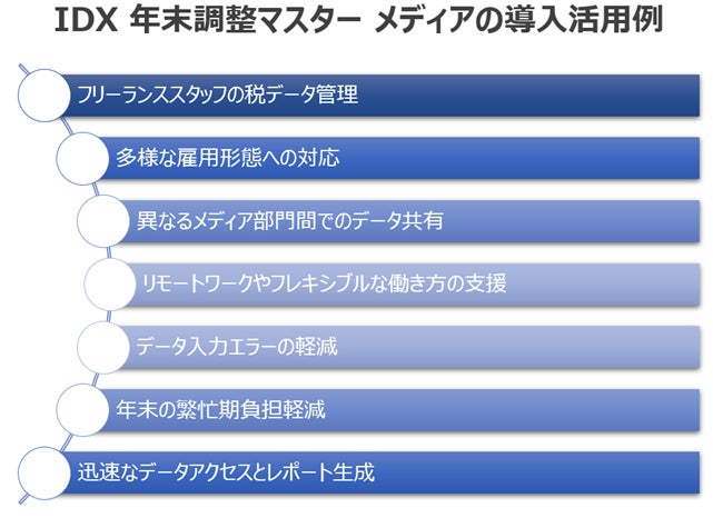 これらの特徴により、「IDX 年末調整マスター メディア」は、メディア業界特有の複雑な年末調整業務を根本から支援し、効率化と正確性の向上を実現します。