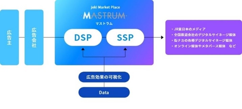 株式会社ジェイアール東日本企画(東京都渋谷区:代表取締役社長:赤石 良治 以下 jeki)とKDDI株式会社 (本社: 東京都千代田区、代表取締役社長CEO: 髙橋 誠 以下 KDDI)は2025年1月29日から、jekiが提供するマーケットプレイス「MASTRUM(マストラム)」を通じて提供するDOOH(注1)と、KDDIデータを活用したターゲティング広告事業に関する協業を開始します。