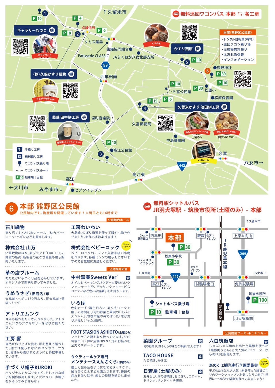 ※JR羽犬塚駅と実施本部を結ぶシャトルバス、各工房を巡る無料の巡回ワゴンを運行します。本部で貸出しの、レンタサイクルもぜひご利用ください(電動自転車あり・有料)