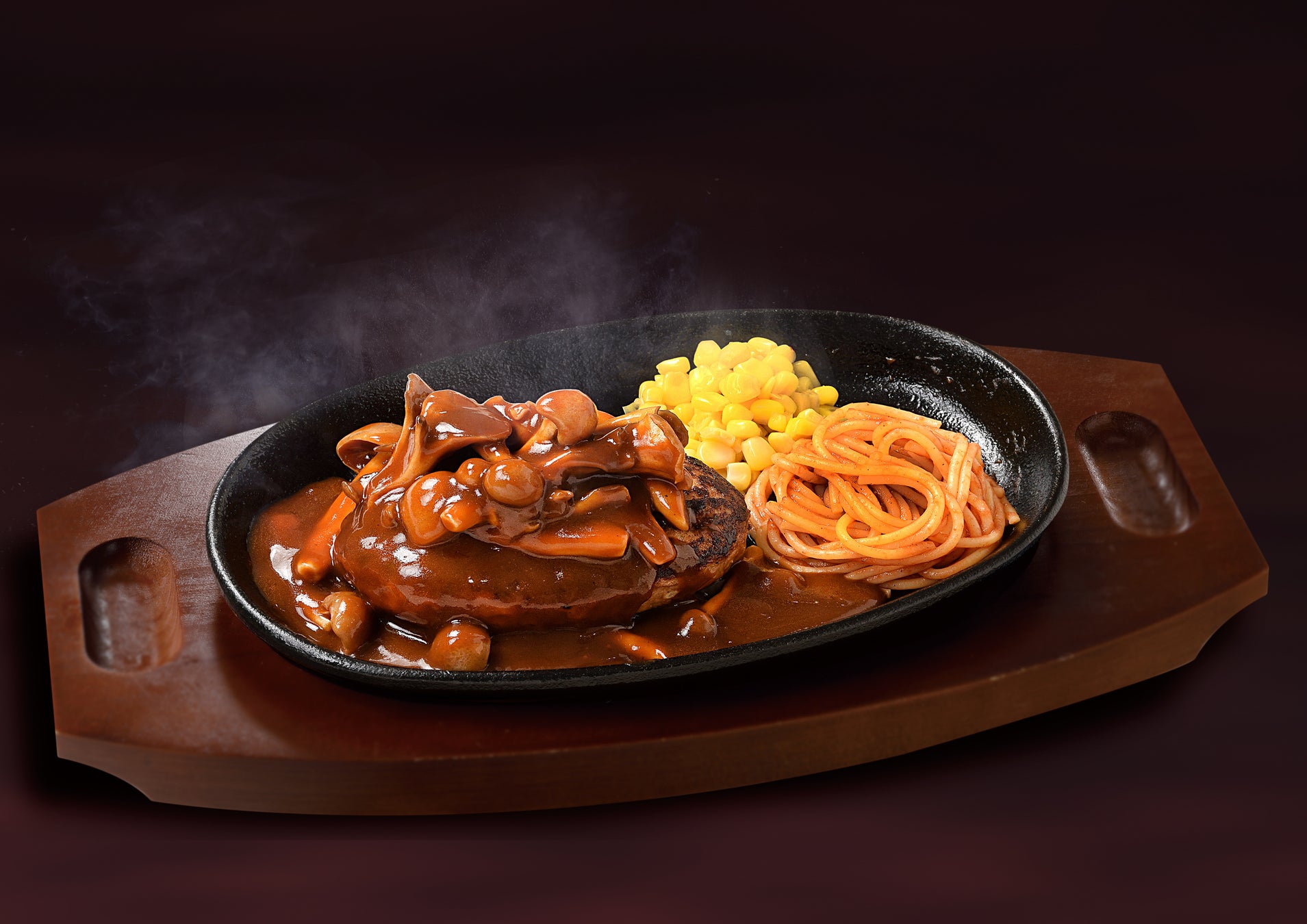 濃厚デミグラスソースにたっぷりのきのこを加えた洋風ハンバーグの定番