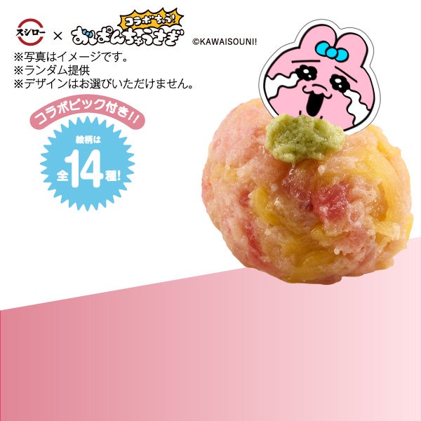 ※コラボピック(全14種)は対象商品1点につき、ランダムで1個お渡しさせていただきます。 ※仕入状況・販売状況により、予告なく販売を中断、または終了する場合がございます。 ※写真はイメージです。実際の商品とは異なる場合があります。 ※仕入状況・販売状況により、使用する食材が変わる場合があります。 ※2023年11月30日(木)に閉店する釧路店(北海道)、戸塚深谷店(神奈川県)、狭山店(大阪府)は「スシロー×おぱんちゅうさぎ」コラボキャンペーン対象外となります。 ※本キャンペーンは、お持ち帰り専門店「スシロー To Go」、「京樽・スシロー」は対象外です。 |