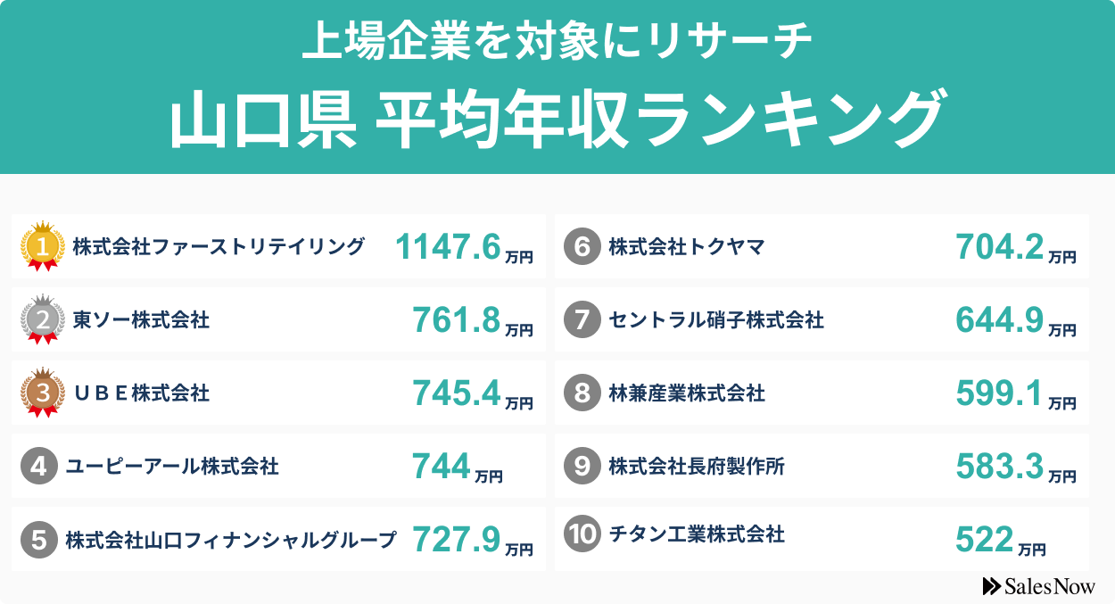【山口県】上場企業平均年収ランキングTOP10!/SalesNow DBレポート