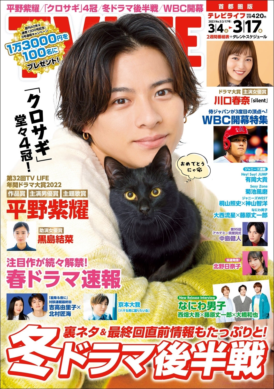 3月1日(水)発売の「TV LIFE 5号(3/17号)」は、4号に続いてTV LIFE 年間ドラマ大賞2022の残り5賞を発表。4冠に輝いた『クロサギ』から平野紫耀(主演男優賞、主題歌賞)、黒島結菜(助演女優賞)、田中健太監督(作品賞)にインタビュー。さらに『silent』で主演女優賞に輝いた川口春奈も登場し、全賞が出そろいます。