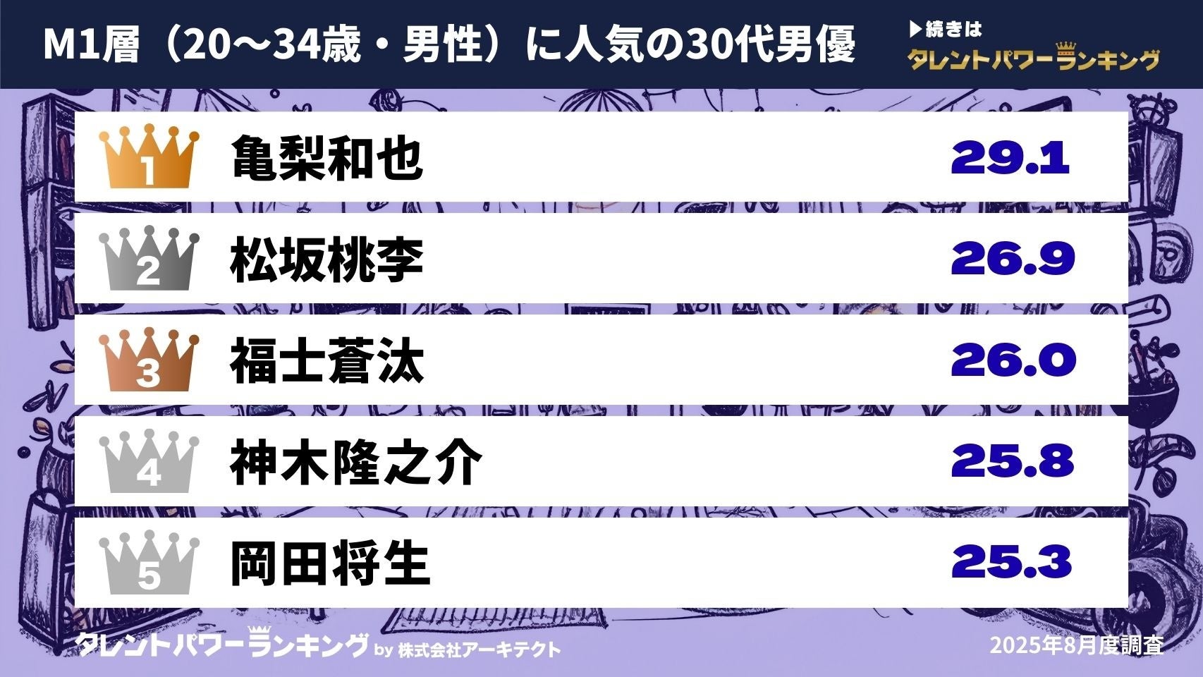 『タレントパワーランキング』では、タレントパワーランキングに登録されている30代男優について、M1層(20〜34歳男性)とF1層(20〜34歳女性)が回答した、それぞれの結果を調査。