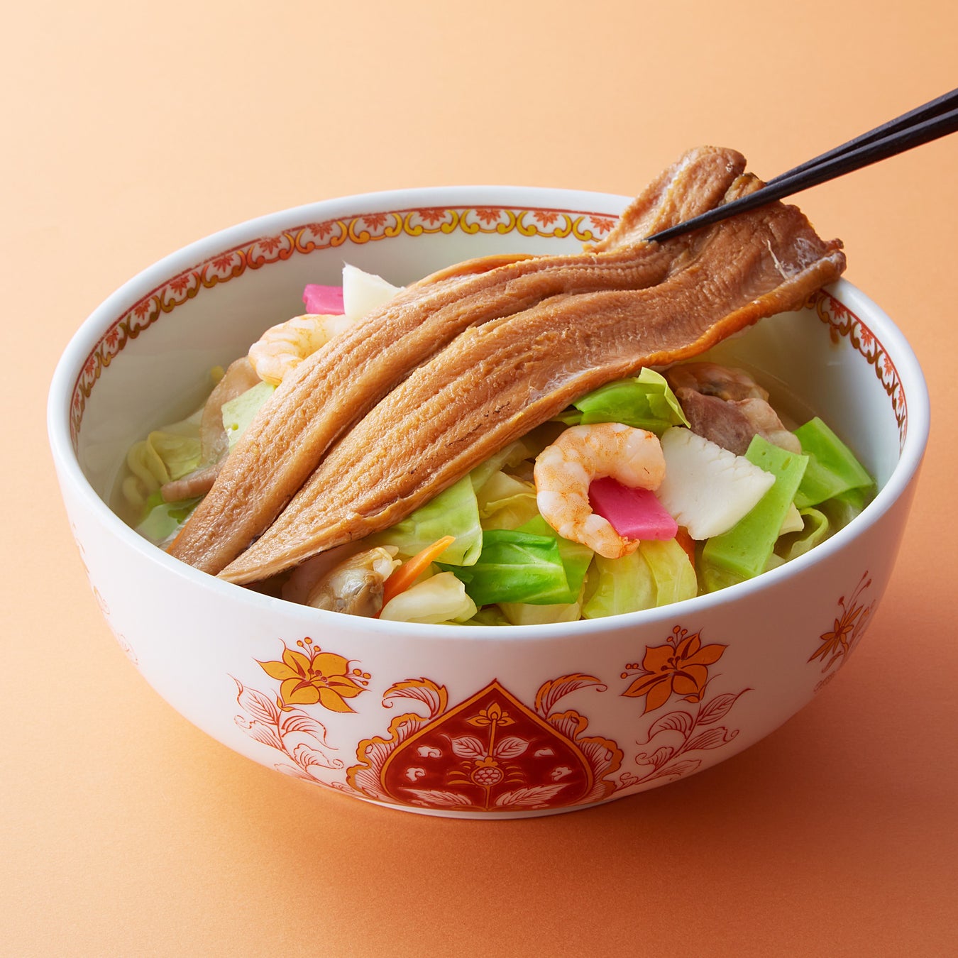 長崎県・対馬産の脂がのった穴子を豪快にトッピング!シャキシャキの国産野菜やモチモチ麺に、昔ながらのあっさりスープが絶妙に絡みます。