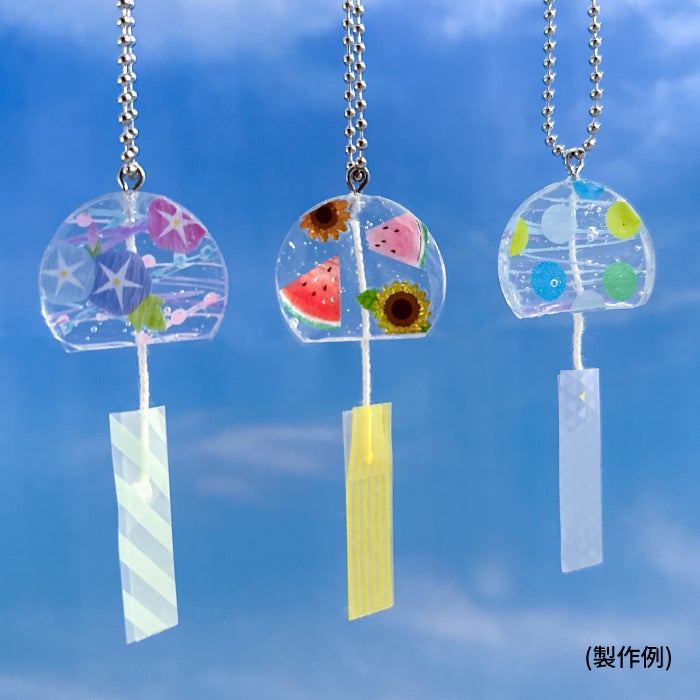 概要:レジンの中に夏らしいモチーフを配置して、涼しげな風鈴チャームをつくります