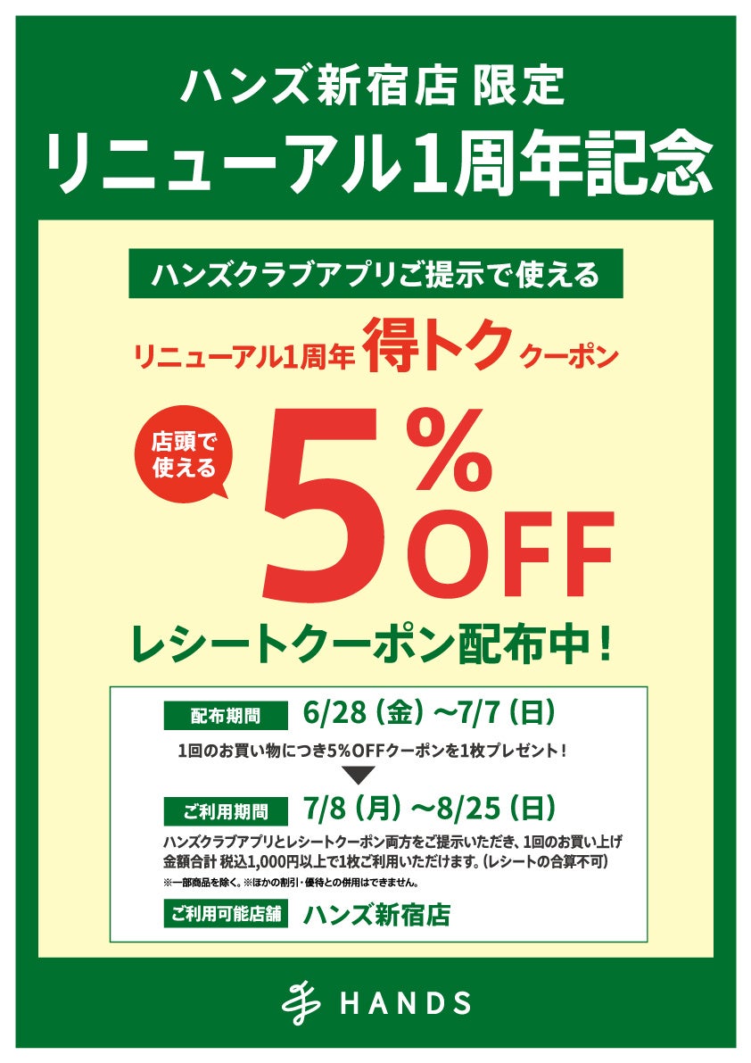新宿店のリニューアル1周年を記念して、配布期間にハンズ新宿店でお買い上げいただきましたお客様へ5%OFFクーポンを配布します。