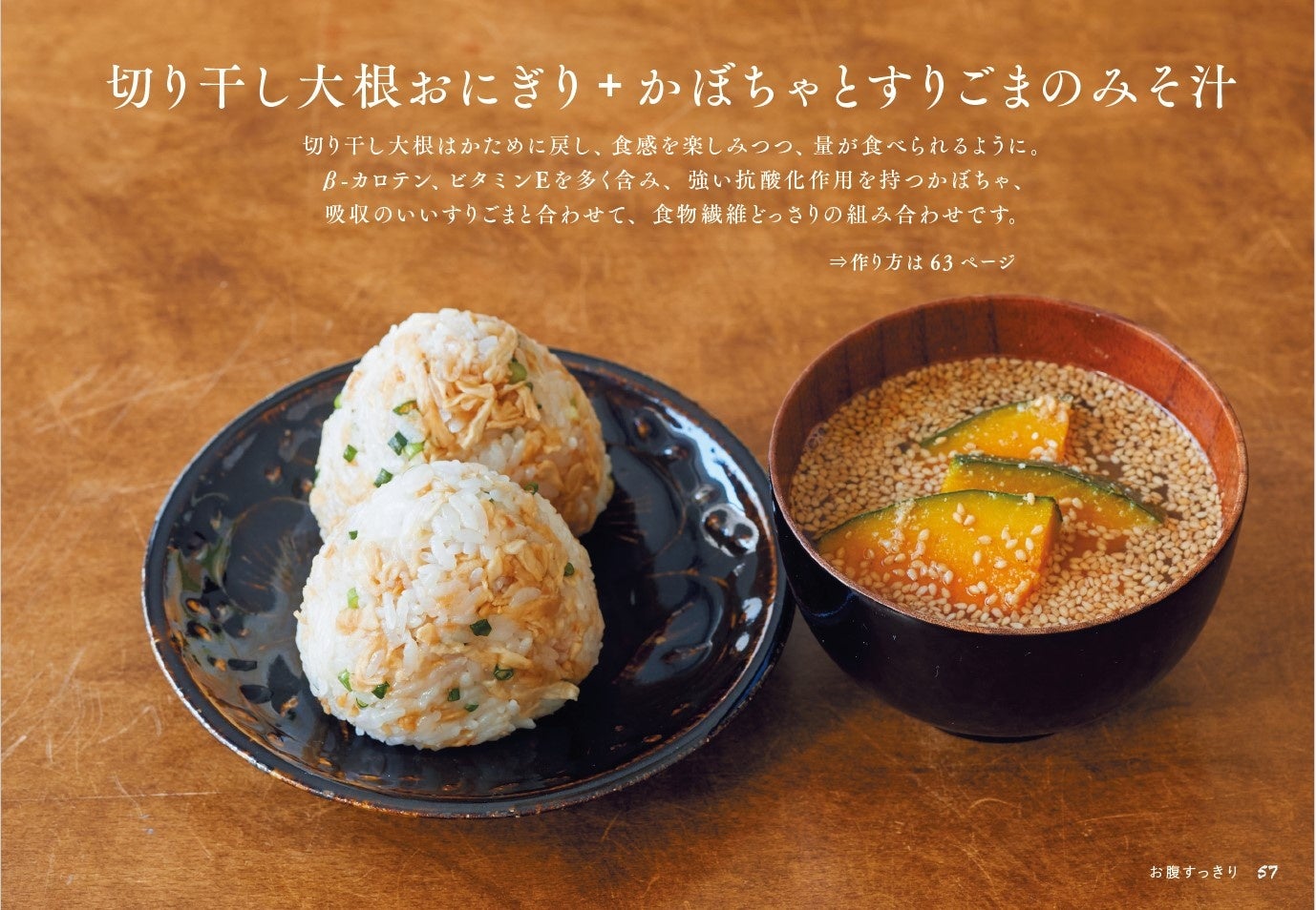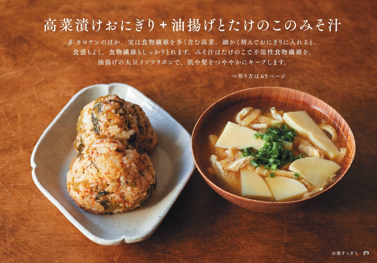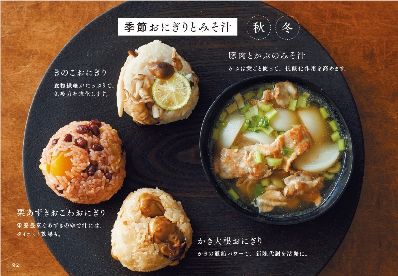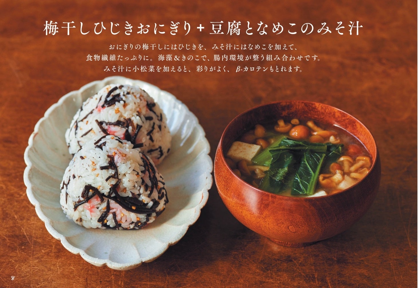 たんぱく質、緑黄色野菜、きのこ、海藻、大豆製品、発酵食品などのからだを整えてくれる食材をたっぷり使ったおにぎりとみそ汁レシピ、パッと作れる即席漬けの合計118点を紹介する一冊。
