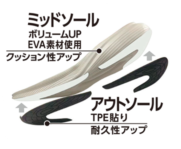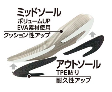 本製品は、ミッドソール部分に耐久性の高いEVA樹脂を使用してクッション性を高めるとともに、アウトソール部分に弾力性と耐久性を合わせ持つTPEを使用し、丈夫で疲れにくいスニーカーです。