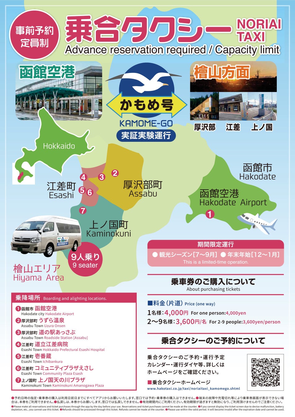 ・ 函館空港から乗り換えなしで各町を経由し、運行する事前予約型のタクシー「かもめ号」