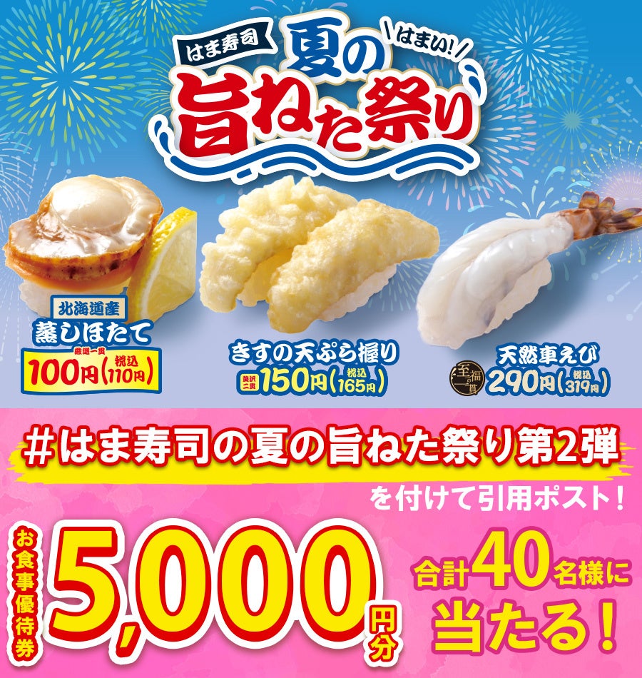 株式会社はま寿司(代表取締役社長:町野 岳 本社:東京都港区)が展開する100円寿司チェーン「はま寿司」は、7月31日(水)より「はま寿司の夏の旨ねた祭り 第2弾」を開催します。