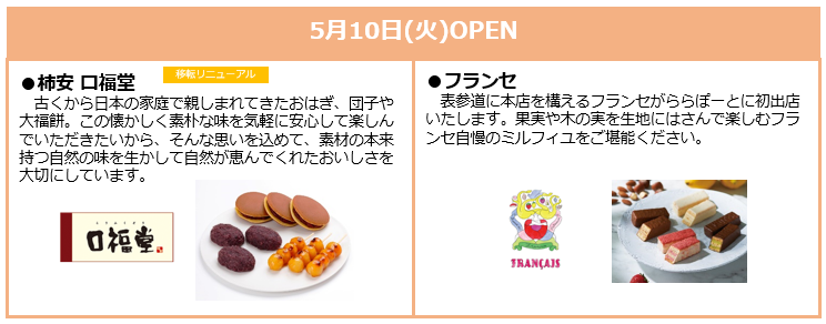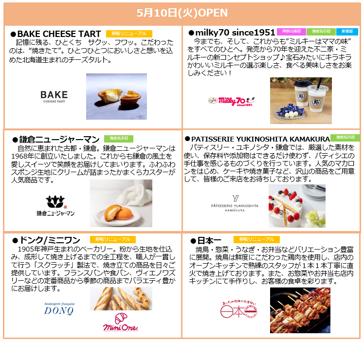 日常のお買い物に便利な青果・鮮魚などの食料品ゾーンの拡充に加え、お土産としても利用できる神奈川県内の人気スイーツ店などが仲間入り。季節ごとに話題の店舗が出店するポップアップショップも新設します。さらに、各店で購入した商品をその場で楽しめるイートインスペースも完備します。
