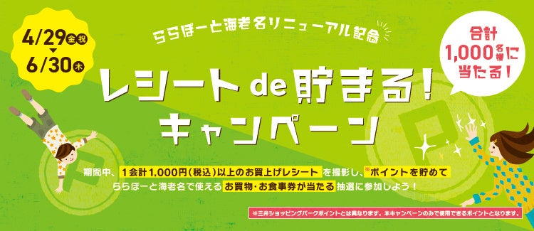 本リニューアルを記念し、2022年4月29日(金・祝)~6月30日(木)の期間、合計1,000名様にららぽーと海老名で使えるお買物・お食事券が当たる「レシートde貯まる!キャンペーン」を開催します。