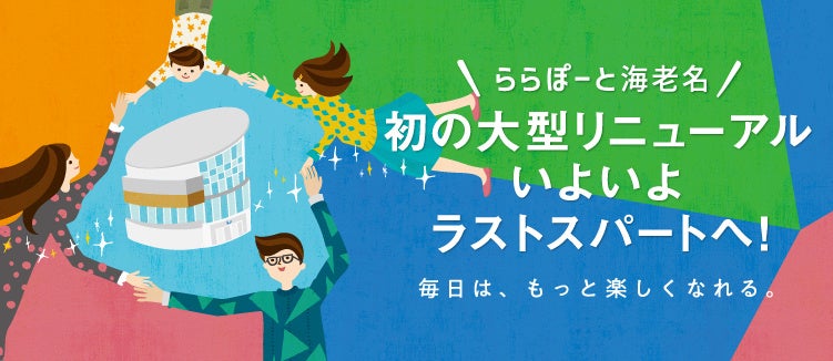 ららぽーと海老名は、お客様が思い思いの時間を安心して楽しく過ごしていただける空間へと進化します。新しく生まれ変わったららぽーと海老名でのお買物を、どうぞお楽しみください。