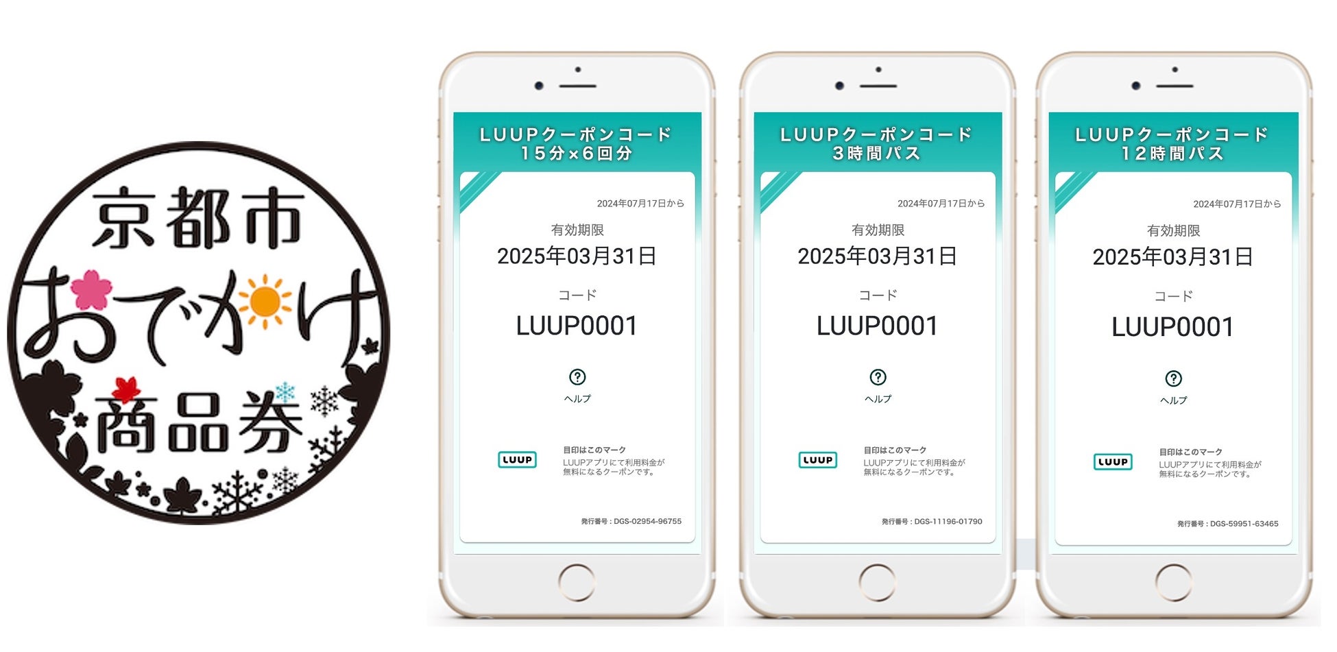 デジタル商品券「京都市おでかけ商品券」は、京都市内でのおでかけや旅行を楽しみながら地域経済に還元することができる、「関西おでかけ納税®」の返礼品です。従来、京都市の「関西おでかけ納税®」の返礼品は、京都市内の加盟店で1円単位で利用できる金額券(※5)を「京都市おでかけ商品券」として提供しておりましたが、この度、返礼品拡充を目的に、「LUUPクーポンコード」を「京都市おでかけ商品券」に追加する運びとなりました。これにより、「京都市おでかけ商品券」は、金額券と「LUUPクーポンコード」の2種類から寄附時に選択いただけるようになりました。また、「LUUPクーポンコード」は「LUUP」のライド料金の支払いに利用可能なデジタルクーポンです。「LUUPクーポンコード」は、「旅先納税®公式ホームページ」や「関西おでかけ納税®公式サイト」から寄附サイトに遷移し、寄附金額および返礼品から「LUUPクーポンコード」を選択し、クレジットカード決済でお支払いいただいた後に、即時に受け取ることが可能です。寄附額に応じて、「3時間×1回分」(寄附額:3,300円)、「15分×6回分」(寄附額:5,500円)、「12時間×1回分」(寄附額:8,300円)の全3券種の「LUUPクーポンコード」が返礼品として贈られます。寄附完了後に「LUUPクーポンコード」が寄附サイト内の「お礼の品」ページに即座に届き、すぐにお使いいただけます。寄附および「LUUPクーポンコード」受け取りの際には、アプリなどのダウンロードは必要ありません。受け取り後は、「LUUP」のアプリでメニュー画面を開き、受け取った「LUUPクーポンコード」に記載されたコードを乗車前に入力することで、各種クーポンを登録でき、ライド料金のお支払いに利用いただけます。なお、「LUUPクーポンコード」の有効期限は寄附のタイミングにより異なります。