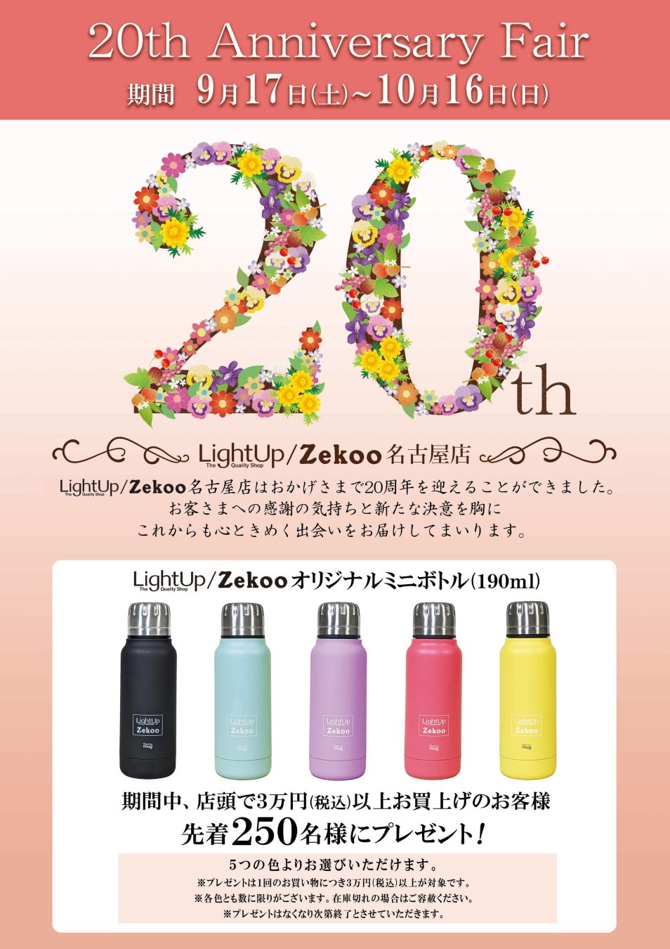 LightUp/Zekoo名古屋店はおかげさまで20周年!日頃のご愛顧に感謝を込めて、オリジナルミニボトルがもらえる20周年記念キャンペーンを9月17日(土)より開催します!