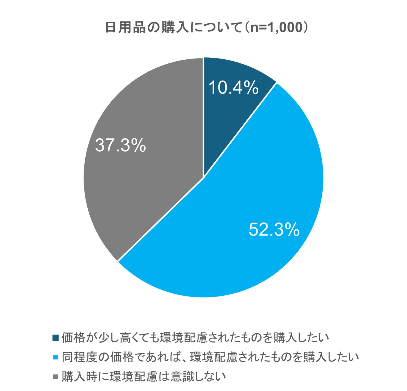 4.<環境配慮した日用品の購入について> 10.4%の人は価格が高くても環境配慮されたものを購入したいと考えているものの、半数(52.3%)の人は同価格であれば、環境配慮された製品を購入したいと回答。