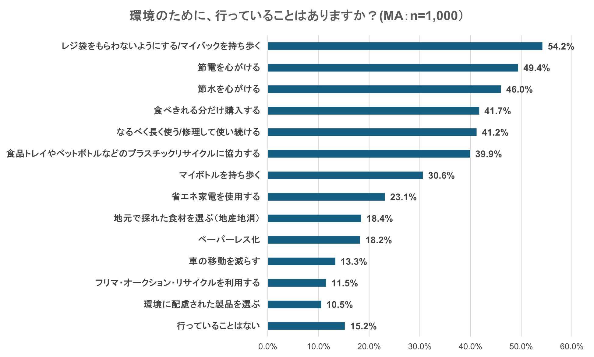 環境問題への関心有無にかかわらず、多くの人が環境問題に対する行動をとっており、具体的な行動としては、「レジ袋をもらわない/マイバックを持ち歩く(54.2%)」、「節電(49.4%)・節水(46.0%)を心がける」などといった行動をしている人が過半数いることがわかりました。上位の行動は、環境への配慮に加え、経済的なメリットも受けられると推察されます。経済的なメリットのある行動が上位を占めました。