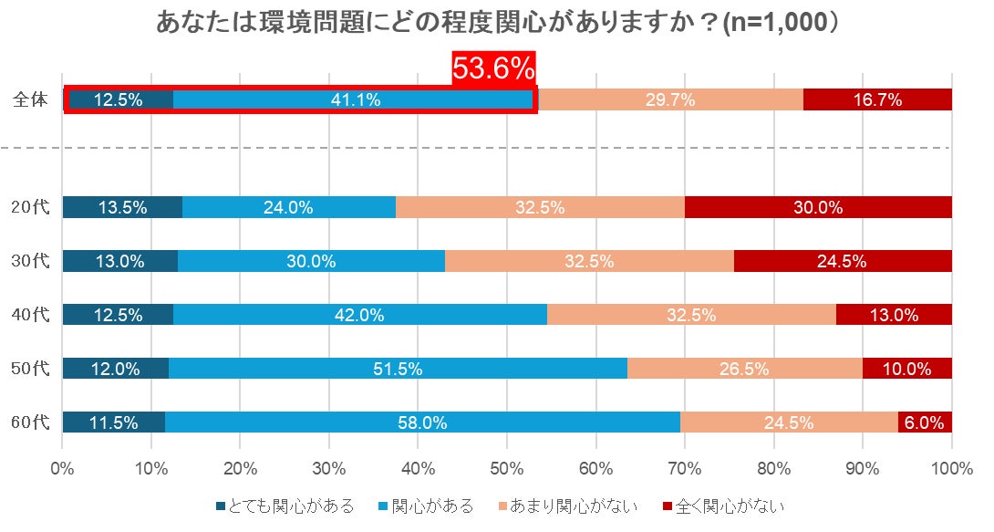 半数の人(53.6%)は環境問題に関心を持っています。年代別にみると、年齢が上がるにつれて、環境問題への関心を持つ人が多くなっています。一方で、「とても関心がある」と回答した人は20代・30代であっても13%となっており、他の年代と変わらず一定数いることがわかります。