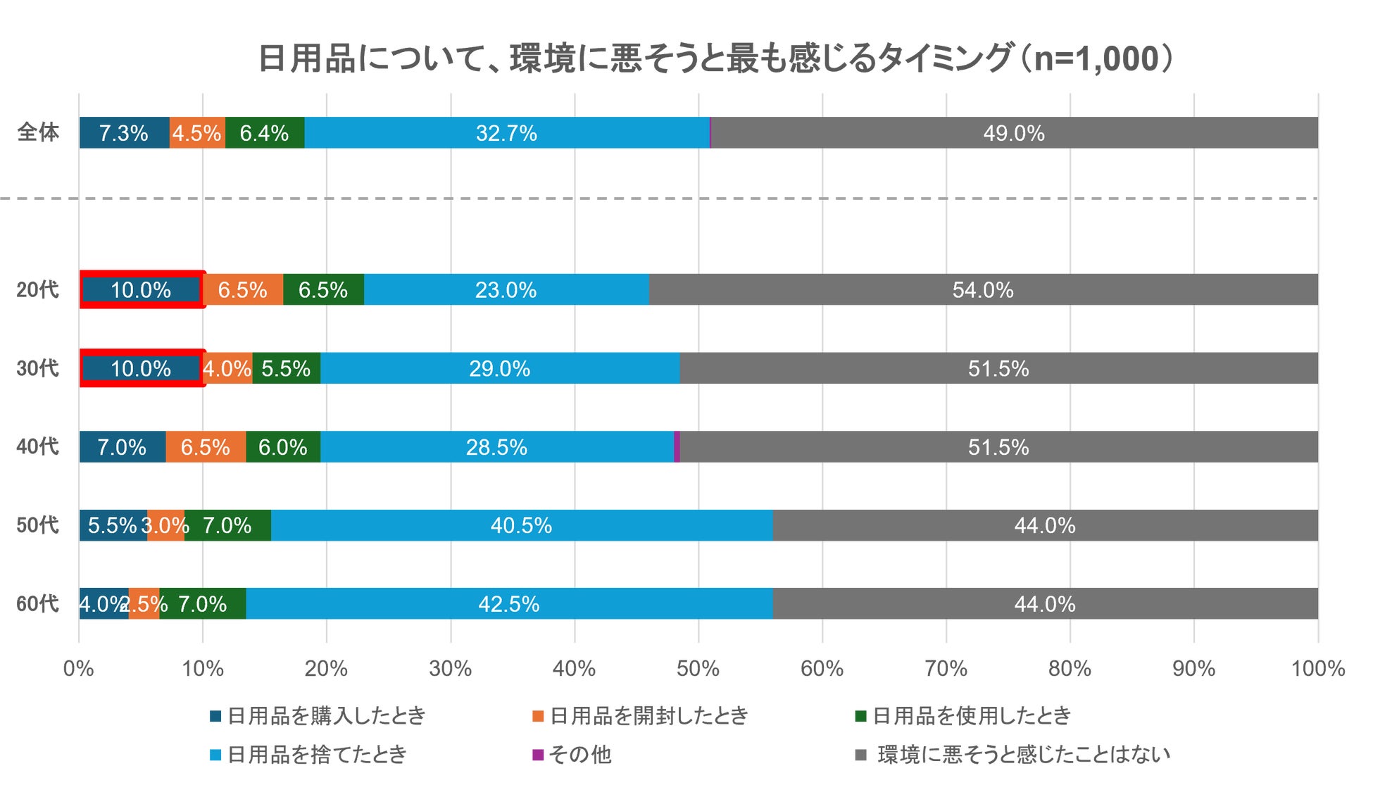 日用品を使用する際、「捨てるとき(32.7%)」に最も環境に悪そうだと感じる人が多く、その理由として、「ゴミが多い・ごみを増やしてしまう」、「容器やパッケージがもったいない」といった意見の他に「プラスチック製品を捨てる時、いつも環境に悪そうだなと感じる」、「汚れたプラスチックゴミはリサイクルできない」といった意見も多く、廃棄時の罪悪感が具体的な行動へつながる要因となっていることがわかります。また、年代別で見ると、50~60代に比べ、20~30代の若年層のほうが、「日用品を購入したとき」に環境への影響を気にする傾向がみられました。