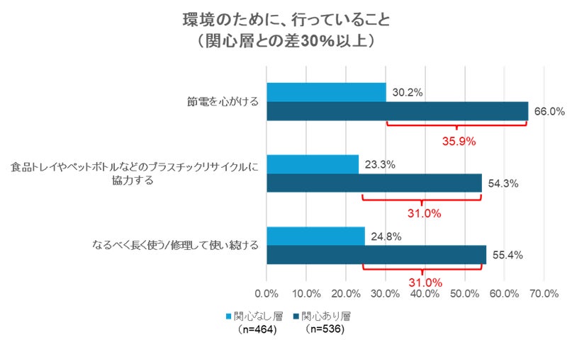また、「節電」、「プラスチックリサイクル」、「なるべく長く使う」という行動は環境問題へ関心のある層と関心がない層と比較すると30%もの差があり、環境問題関心層は、資源の節約、再利用、ゴミの削減に配慮した行動をとっていることがわかります。