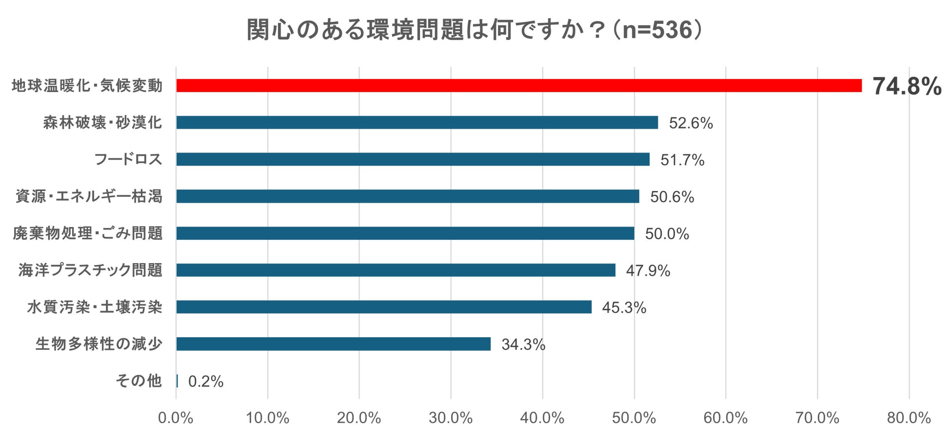 環境問題に関心があると回答した人(n=536)のうち、74.8%もの人が「地球温暖化・気候変動」に関心があると回答しました。次に多い「森林破壊・砂漠化」の52.6%より22.2%も高い結果となっています。