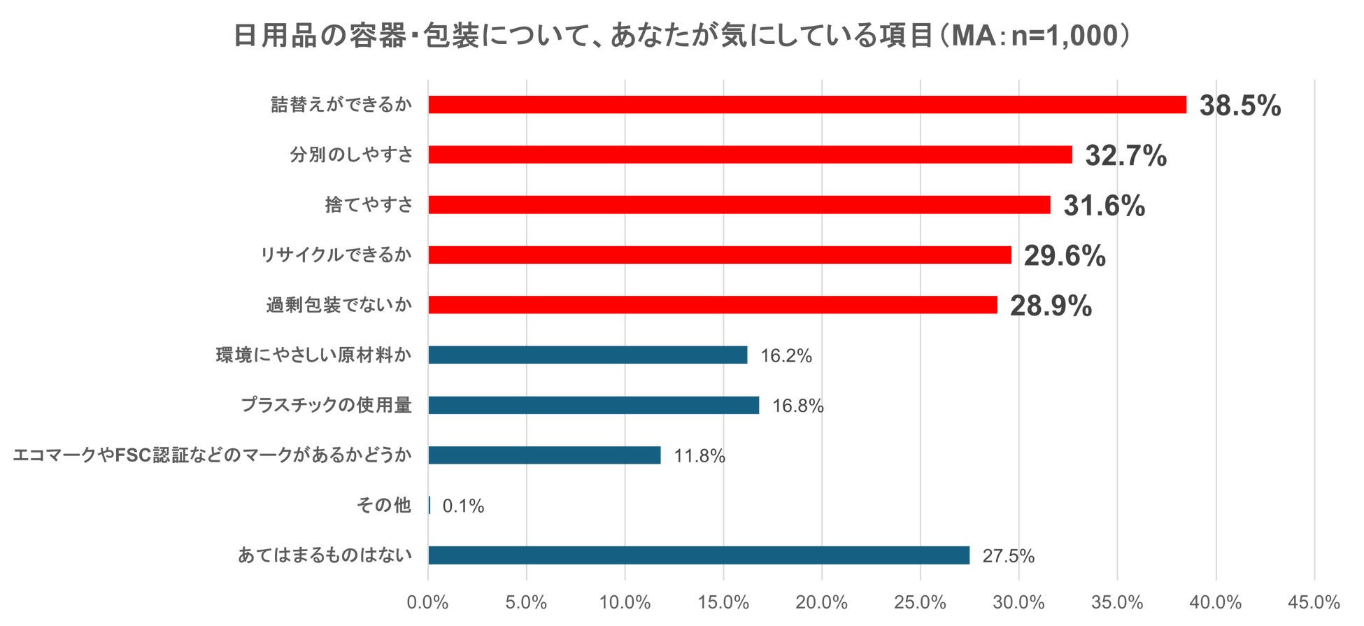 日用品の包装・容器については、「詰替えができるか(38.5%)」、「分別のしやすさ(32.7%)」、「捨てやすさ(31.6%)」、「リサイクルできるか(29.6%)」が3割近くの人が気にしており、多くの人が感じる廃棄タイミングの罪悪感を払拭できるような容器・包装の製品が求められていることがわかります。