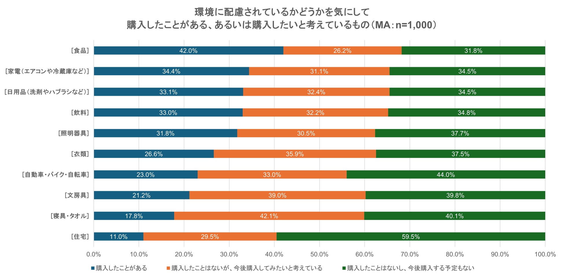 環境に配慮した製品を買ったことがあるカテゴリーとして「食品(42.0%)」「家電(34.4%)」「日用品(33.1%)」「飲料(33.0%)」が上位となるが、いずれも半数以下となっています。しかし、意向はあるものの実際の購入まで至っていないカテゴリー多く、意向も含めると「住宅」以外の比較的身近な生活に必要なアイテムについては、半数以上が環境に配慮した製品の選択意向があると考えられます。