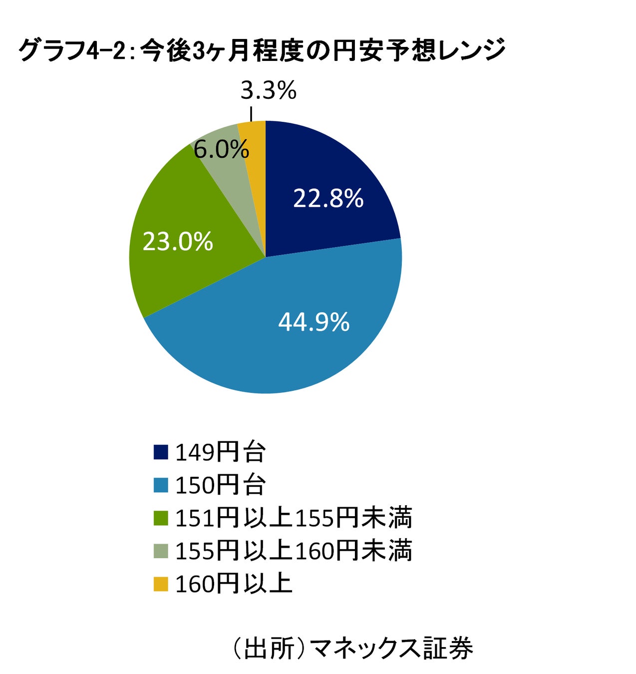 また、定例調査ではありませんが補足として「円安になると思う」と回答した方に、どこまで円安が進むと思うかをたずねました。最も多い回答は150円台で全体の44.9%となり、続いて151円以上155円未満が23.0%となっています。