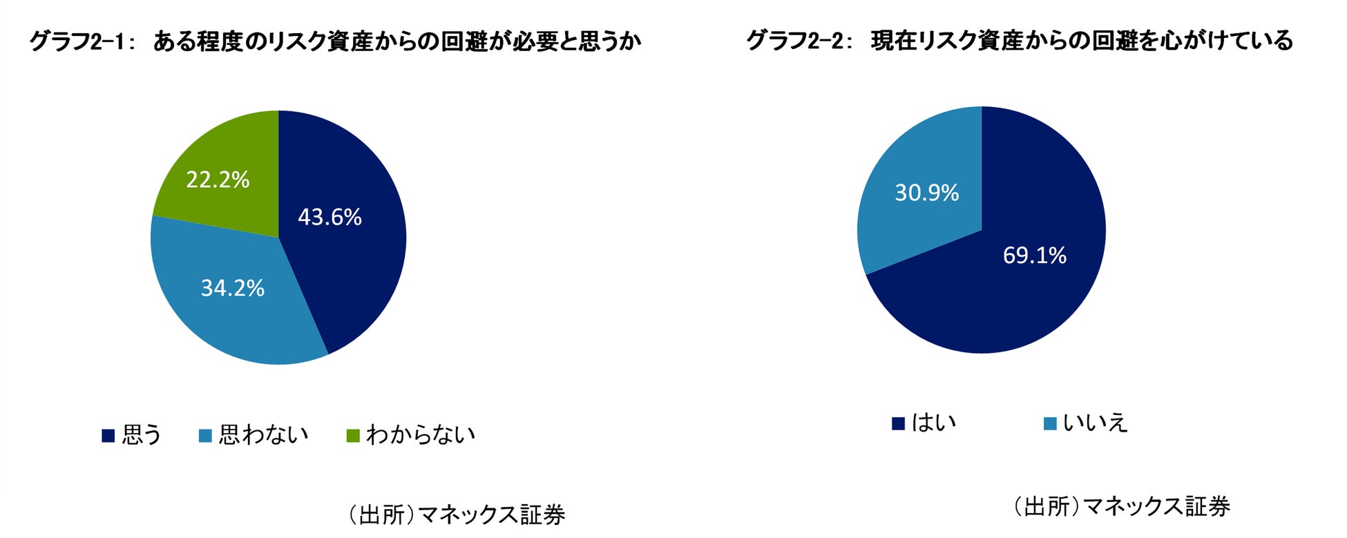 リスク資産からの回避が必要と思う投資家は半数に満たないものの、わからないという回答も一定数あり、リスク資産からの回避を心がけている投資家は7割近い結果となりました。