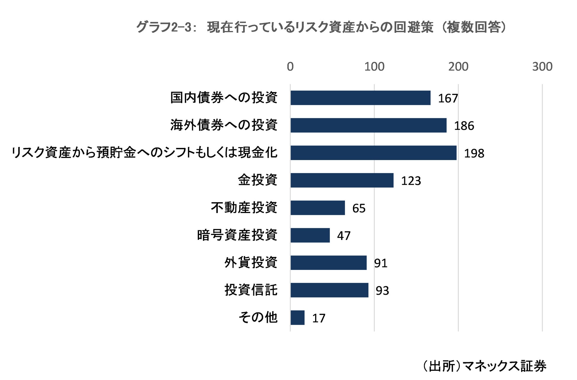 リスク資産から預貯金へのシフト、もしくは現金化という回答が最も多くなりました。続いて海外債券への投資、国内債券への投資、金投資となりました。