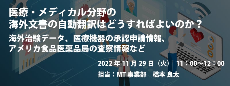 高精度AI自動翻訳の開発・運営を行う株式会社ロゼッタ(本社:東京都千代田区 代表取締役:渡邊 麻呂)は、無料ウェビナー『医療・メディカル分野の海外文書の自動翻訳はどうすればよいのか? ~海外治験データ、医療機器の承認申請情報、アメリカ食品医薬品局の査察情報など~』を2022年11月29日(火)に開催いたします。