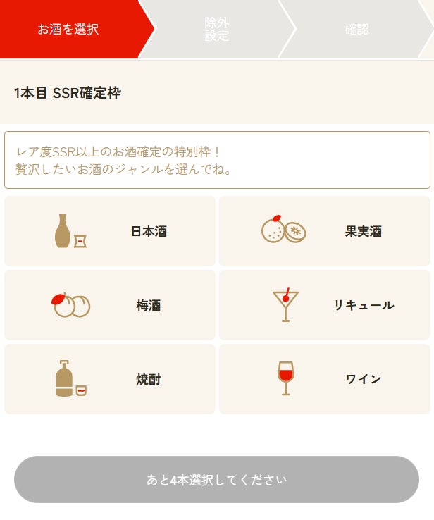「新しいお酒と出会ってみたいけど、失敗するのが怖い」というお客さまからの声を受け、「酒ガチャ」では1本ずつ届くお酒のカテゴリを選択することができるようになっています。好きなカテゴリのお酒を選択できるほか、苦手な原料を除外するなど、自分好みの組み合わせにカスタマイズできます。お花見シーズンに飲みたいと多く回答が集まった、日本酒やサワー、果実酒、リキュールを選択することもできるので、お花見シーンにもぴったりです。