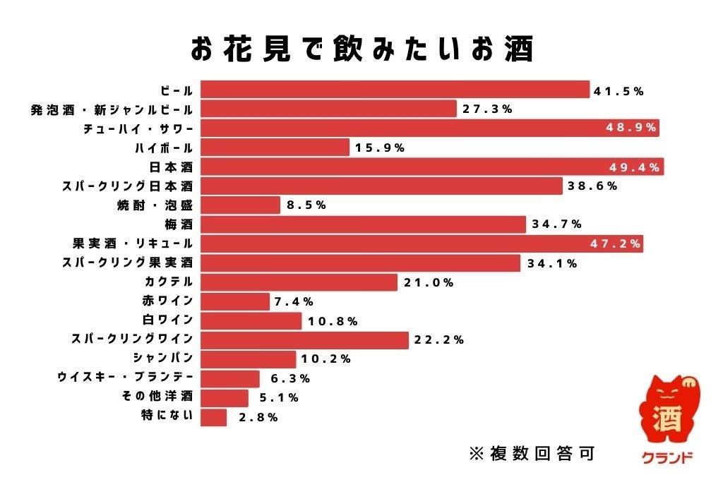 2025年2月16日(日)~2月24日(月)に「クランド」のメールマガジン会員、公式Xフォロワーを対象に実施したアンケート調査では、お花見に飲みたいお酒を聞いたところ、最も多かったのが「日本酒」で49.4%でした。次が「チューハイ・サワー」で48.9%、「果実酒・リキュール」が47.2%と続きました。
