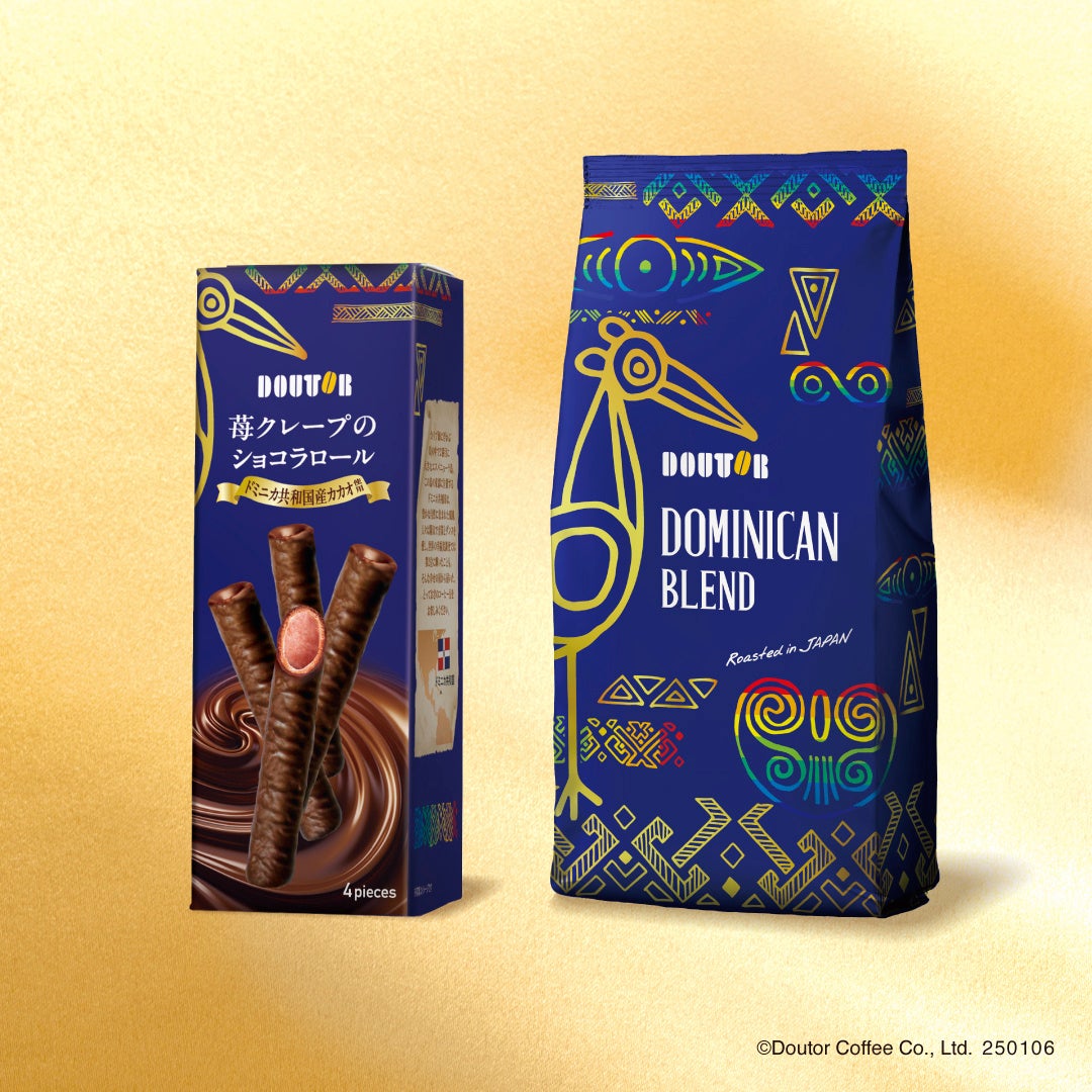 ドミニカ共和国のコーヒー豆とカカオ豆を使用した商品のマリアージュを楽しめる、「ドミニカンブレンド」のコーヒーと「苺クレープのショコラロール」のお得なセットをご用意しました。コーヒー好きの方へのプレゼントやバレンタイン、手土産にもおすすめです。