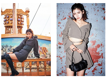 デザイナーである新音さんが描いたイラストが施されたデニムパンツやニット、今季のブランドアイコンでもあるライダースジャケット、地厚ながらもウエスト部分をタイトに仕上げたスウェットフーディとスカートのセットアップなど、カジュアルな中にもシルエットや着心地にこだわったアイテムが登場。アウターはボアやエコファーがついたコート、ショート丈のボリューミーなダウンなどが揃います。トップス肩や背中、ウエスト部分が深く開いたボディースーツやニットなど、肌見せをさらにおしゃれに仕上げてくれるデザイン。ボトムスはスリットが深く入ったロングスカートや、パラシュートパンツ、ワイドなエコレザーパンツ、そしてツイードのミニスカートまで全てに本人のこだわりの大きめなポケットが付いています。