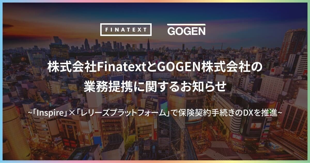 次世代金融インフラの提供を通して組込型金融を実現するFinatextグループの株式会社Finatext(本社:東京都千代田区、代表取締役CEO:木下 あかね、以下「Finatext」)と、不動産売買支援ハブ「レリーズプラットフォーム」などを開発・提供するGOGEN株式会社(本社:東京都港区、代表取締役CEO:和田 浩明、以下「GOGEN」)はこの度業務提携し、「レリーズプラットフォーム」にFinatextのSaaS型デジタル保険システム「Inspire(インスパイア)」の保険申込機能を組み込む開発に着手しました。