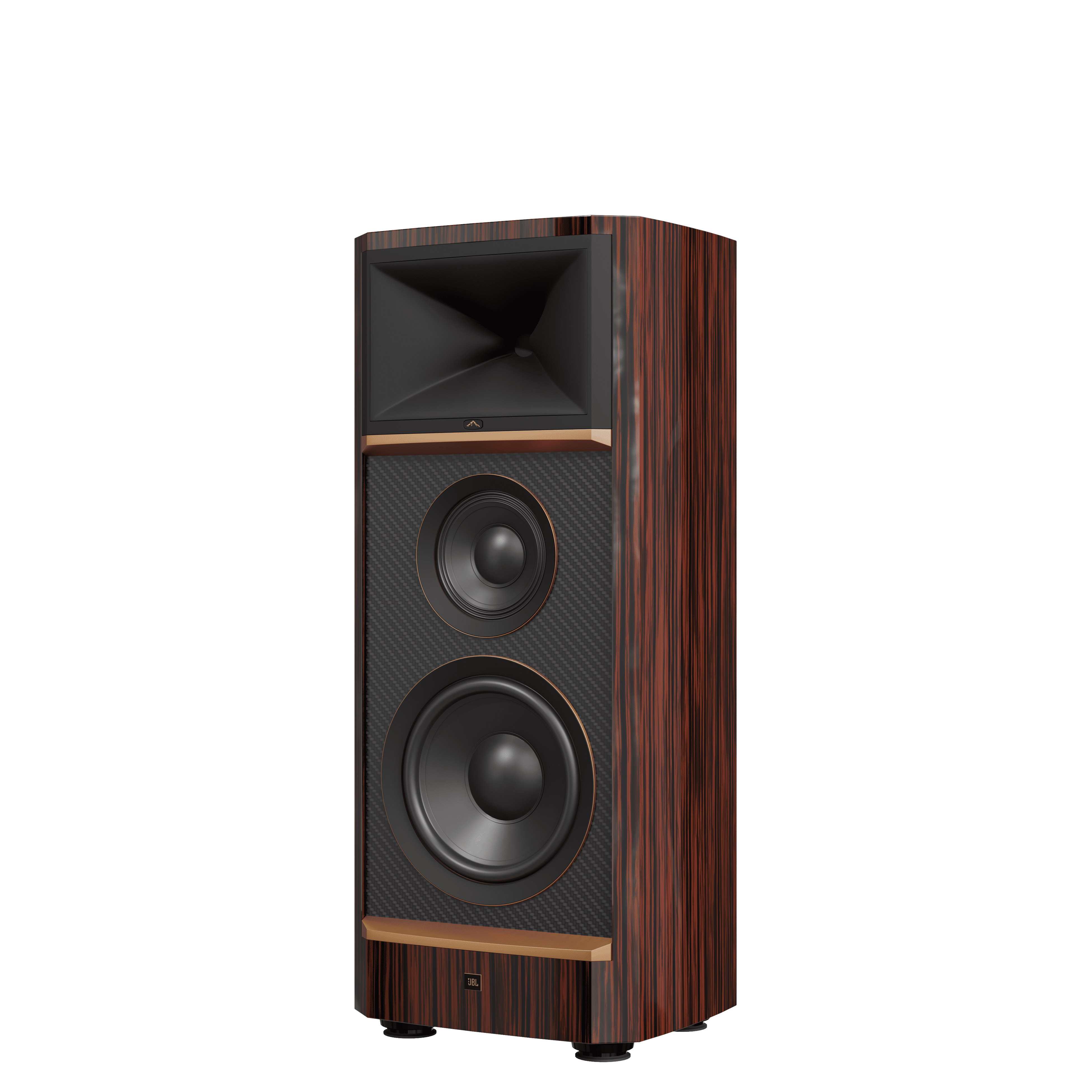 柔らかな輪郭を持ち、さまざまなインテリアにマッチする時代を超越したデザインと、音質面においては不要となる共振を排除する構造および堅牢なブレーシングを施したゴールドのアクセントが美しい重厚なエボニー仕上げのキャビネットを採用。さらにJBLスピーカーシステムとしてははじめてJBL IsoAcoustics™調整式アイソレーションフィートが組み込まれています。スピーカー端子にはカーボンファイバーでコーティングされたロジウムメッキ採用のバインディングポストを搭載。そして、純度の高い音楽信号を各ユニットに届ける独自のMultiCap™クロスオーバーネットワークを搭載しています。