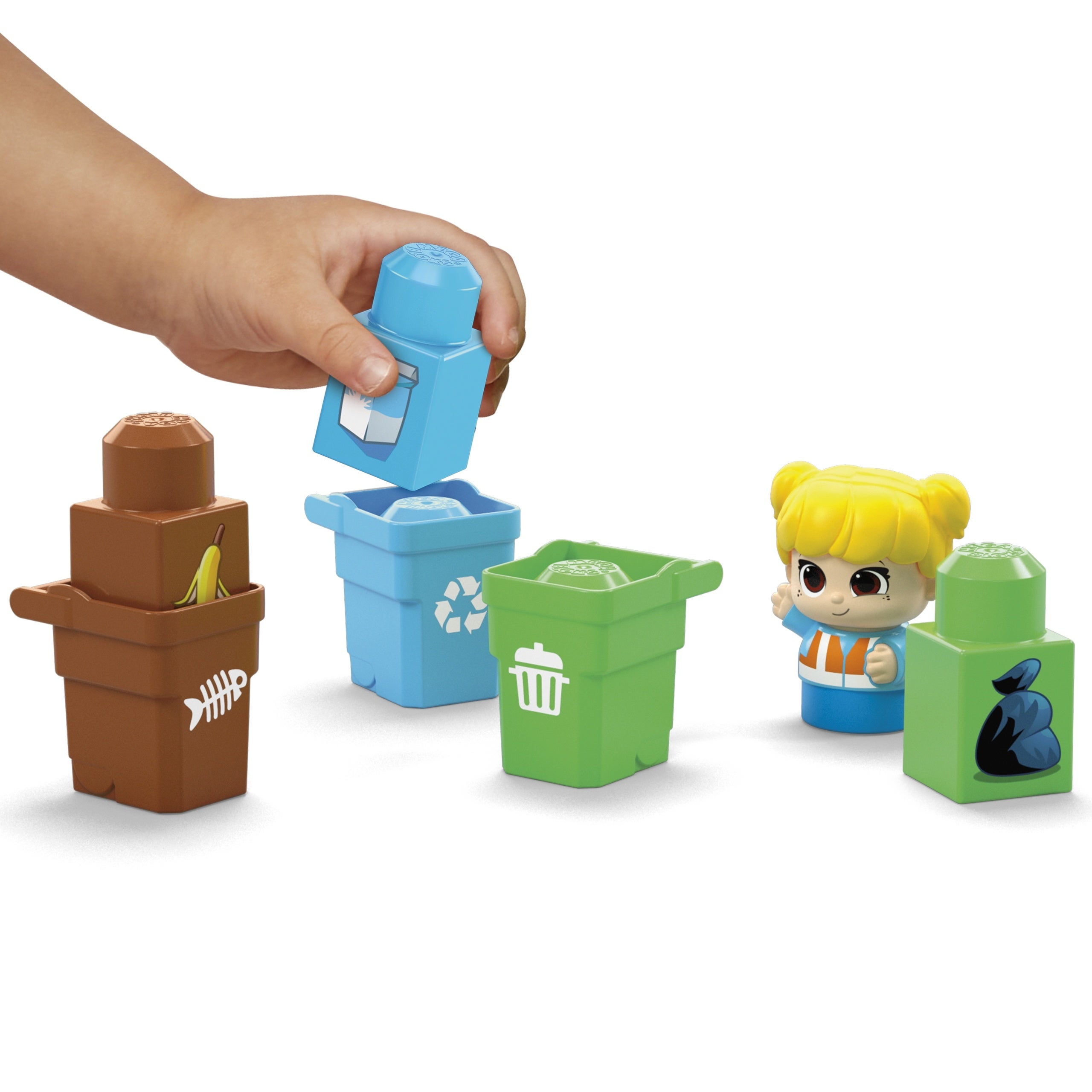 ごみ収集車とキャラクターを含めた全17ピースで、ごみの分別やリサイクルについて学ぶことができるブロックセットです。ごみ箱にはそれぞれマークが描かれていたり色分けされたりしているので、それに合わせてごみを分別することができます。牛乳パックなどの紙類はリサイクル、生ごみはコンポストすることもできます。ごみを分別して収集車に積む遊びを通して、色の識別や手先の器用さを育むだけでなく、環境にやさしいくらしについて考えるきっかけづくりにもなります。