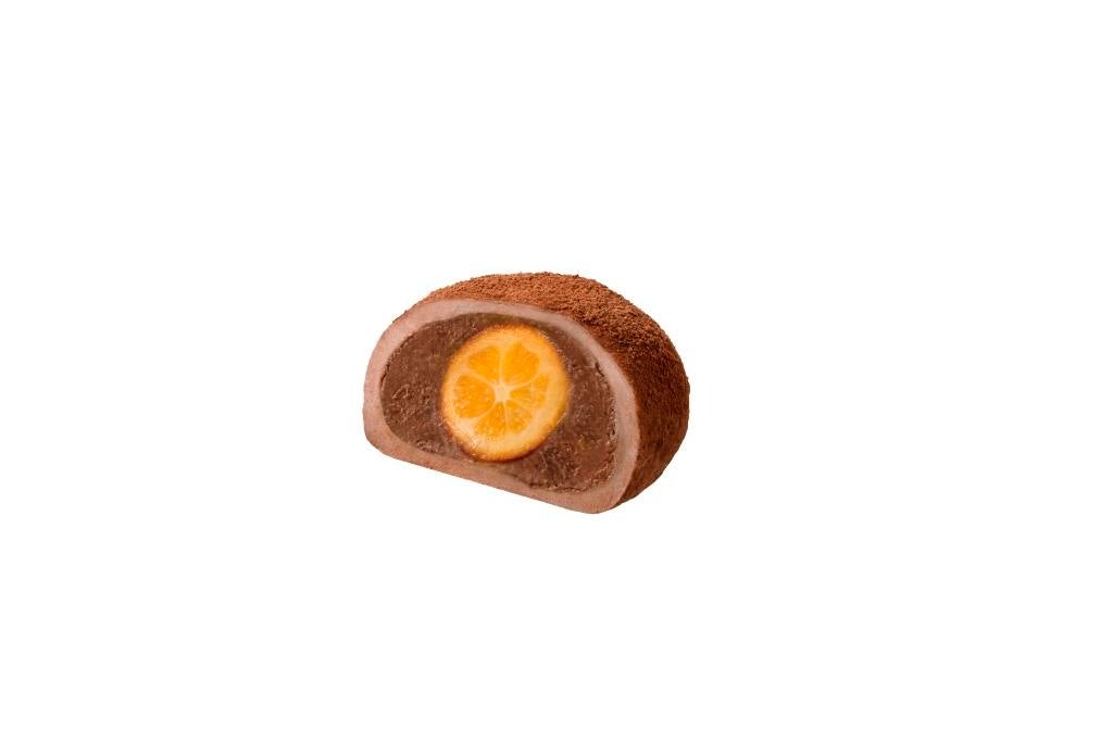 皮に甘みがあり果肉にほどよい酸味を感じる鹿児島県産の完熟きんかんと、ベルギー産チョコレートを使用した濃厚でなめらかなチョコレートクリームを、ココア入りのもっちり食感のお餅で包み、ココアパウダーで贅沢にコーティングしました。
