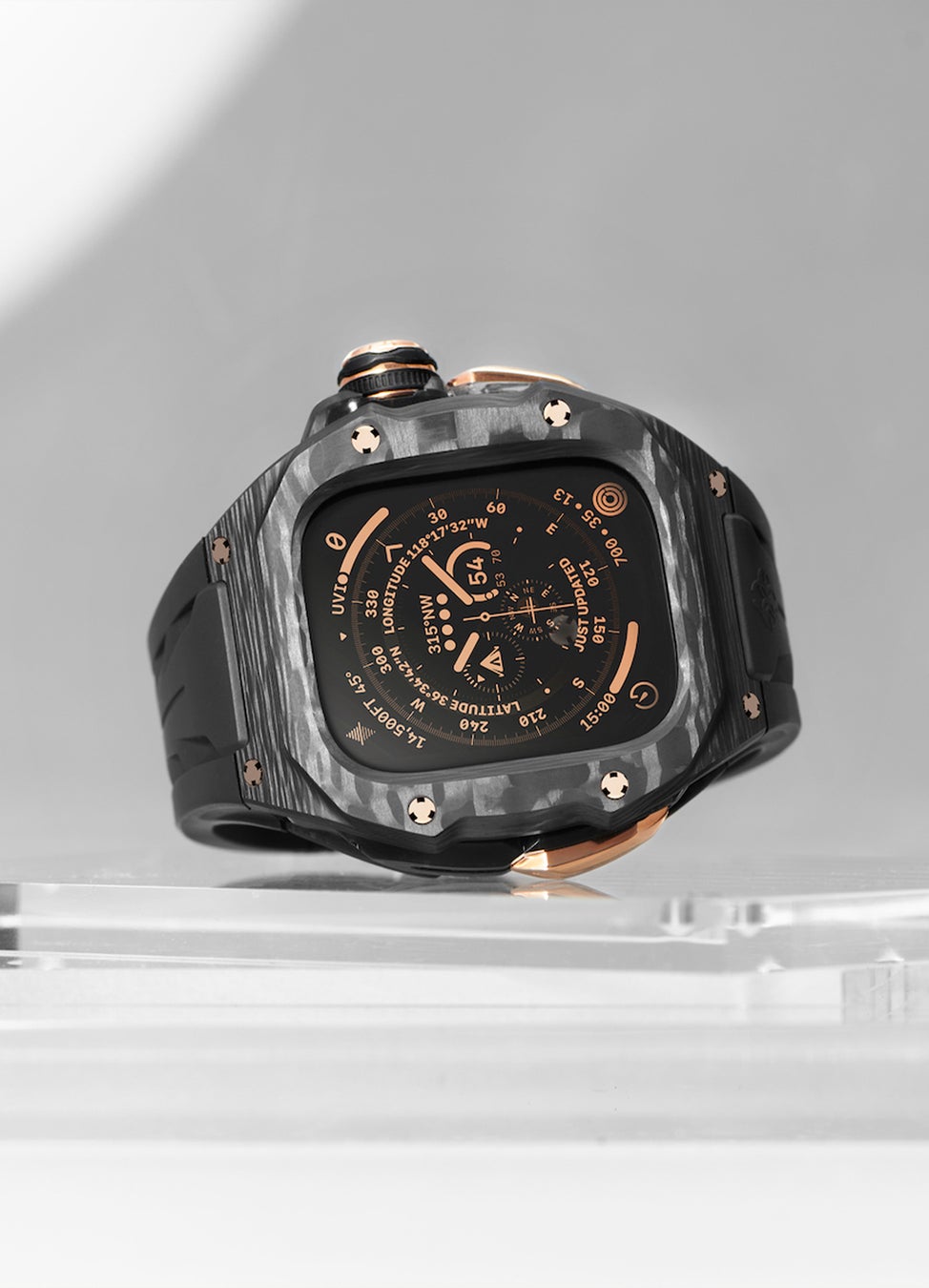 アップルウォッチウルトラの洗練されたモダンな外観に合わせデザインされた、50を超える精密パーツの組み合わせから出来ており、操作性を損なう事なくカーボンファイバーの特徴的な外観と、高い耐久力を両立しています。