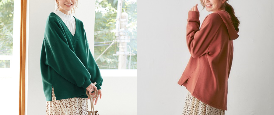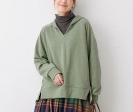今回は、レイヤードスタイルが楽しめるパーカーとチュニックの2点をご紹介します。どちらも深めのVネックデザインとなっているため、クルーネックやタートルネックなどのインナーと合わせるだけで、簡単にこなれ感のある着こなしが完成。ゆったりとした身幅なので、体型カバーにもおすすめです。ぬくぬく気持ち良い着心地でありながら、トレンドをおさえたコーディネートが楽しめる、今季イチオシの商品です。