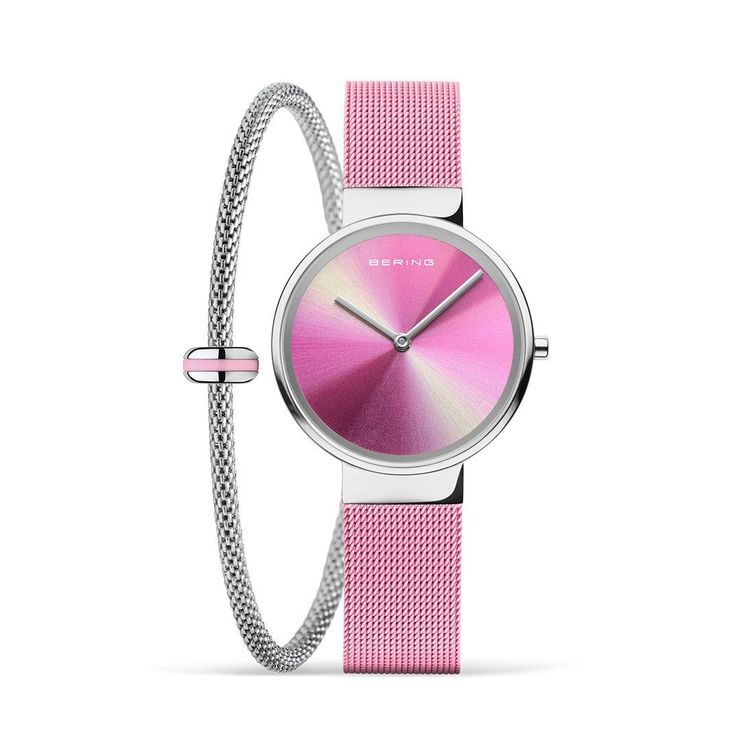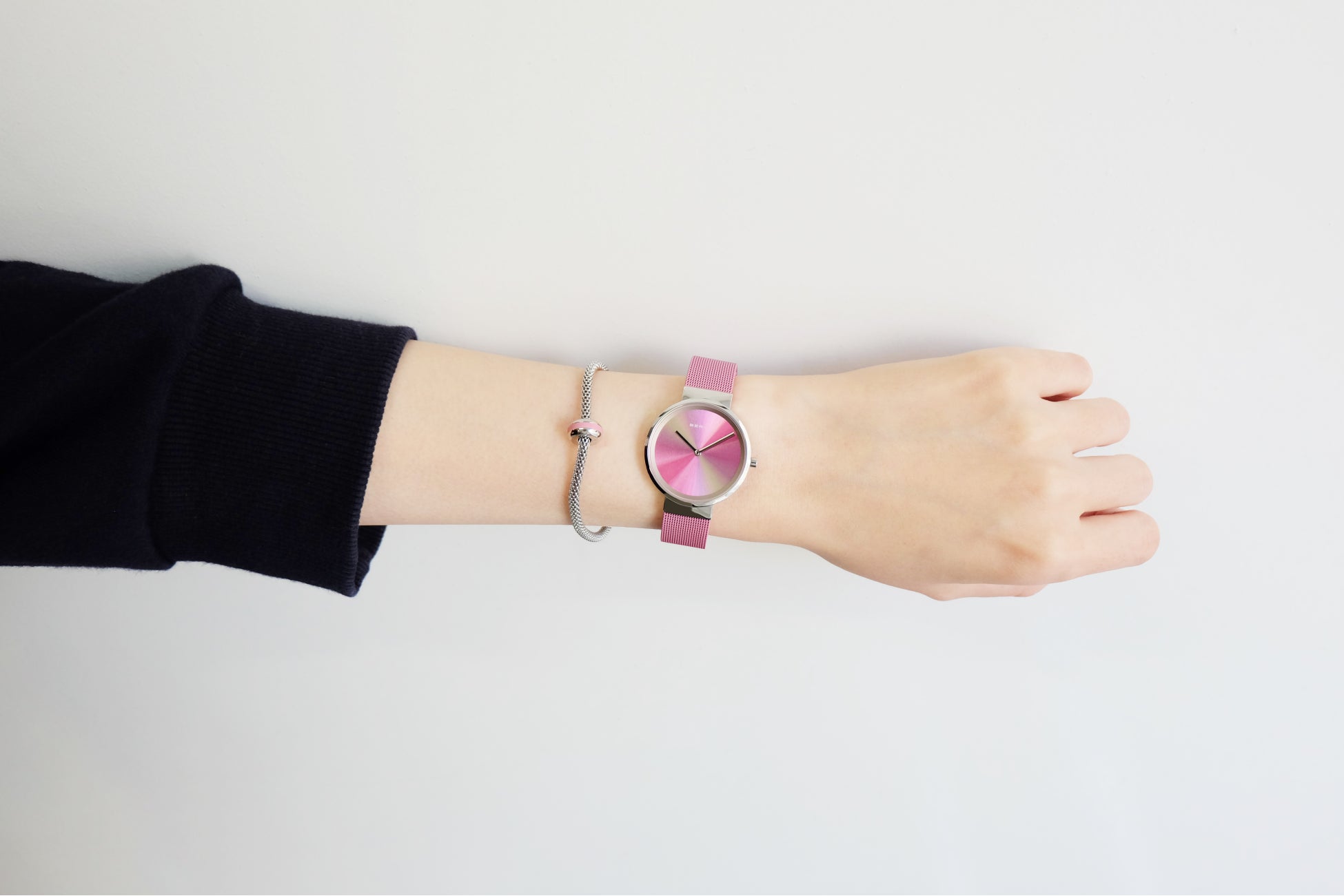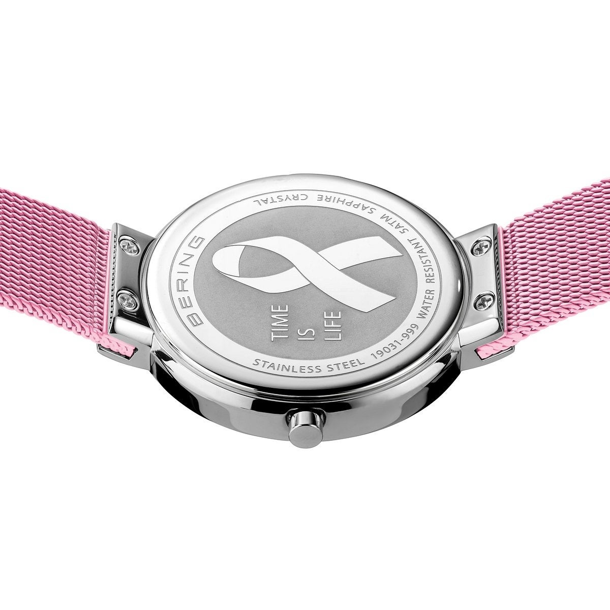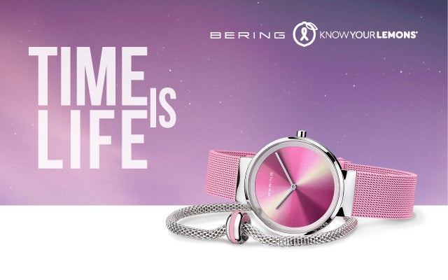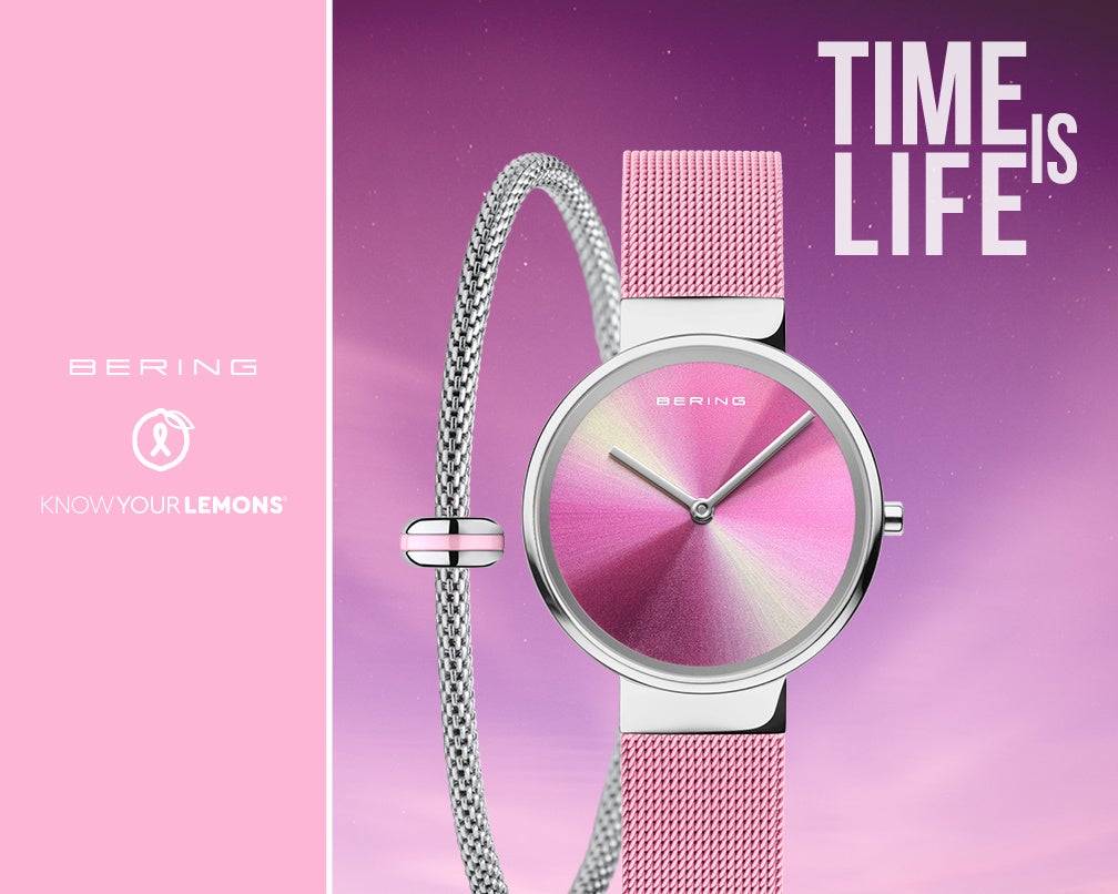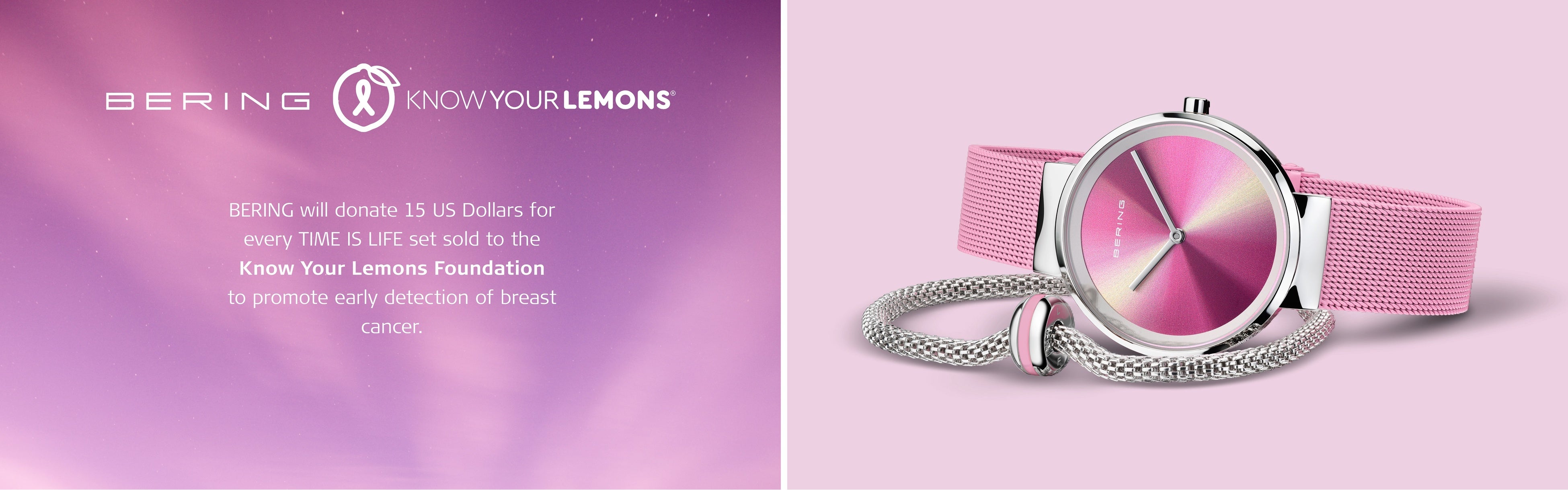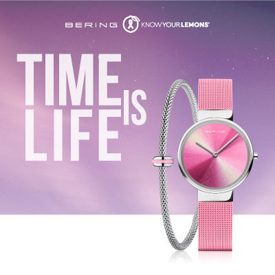BERINGは「TIME IS LIFE」のプロジェクト用にスペシャルエディションを作成しました。個性的で目を惹くピンク色の時計に同じ色の装飾が施されたチャーム付きブレスレットがセットされています。このTIME IS LIFEの購入で、Know Your Lemons財団へ$15のサポートに繋がります。時計は透明度が高く傷の付きにくいサファイアガラスに、肌に優しいサージカルスチールを採用。スチールのクールな外観とシンプルでクリアなBERINGウォッチのデザインがマッチする美しいコレクションです。裏蓋には特別な刻印が刻まれ、専用のBOXに入れてお届けします。