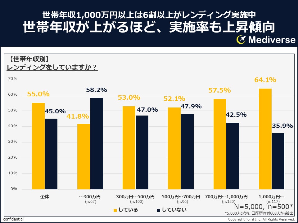 世帯年収別に見ると、レンディング実施有無には、世帯年収差が見られた。